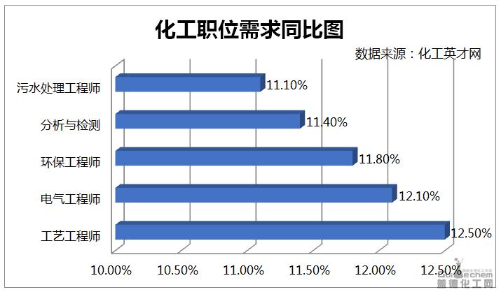 從需求的職位分類來看,化工英才網的招聘數據顯示,工藝工程師、電氣工程師、環保工程師、分析與檢測、汙水處理工程師的職位招聘需求與去年同期相比上漲幅度明顯,同比漲幅分別為12.5%、12.1%、11.8%、11.4%、11.1%。